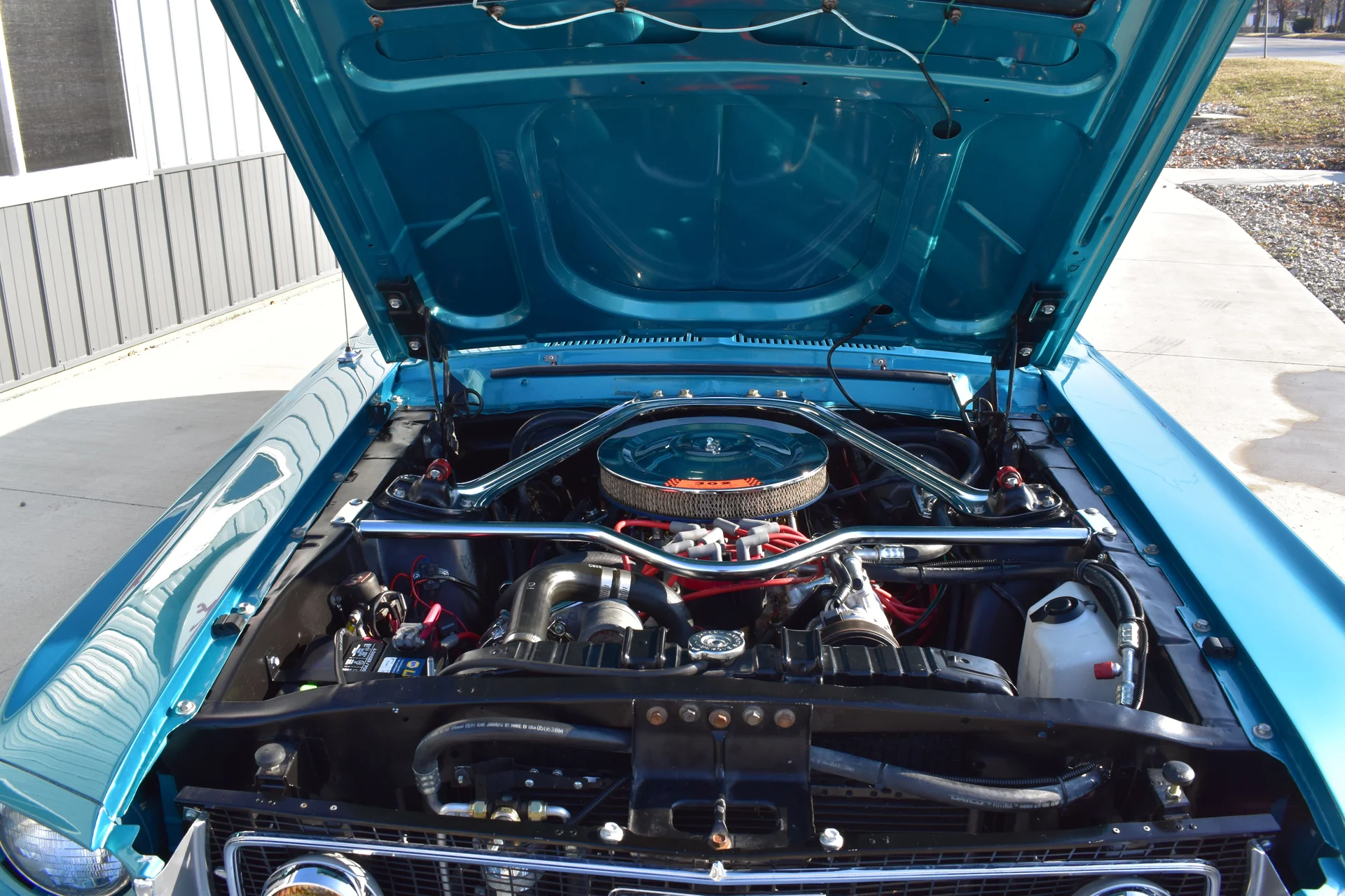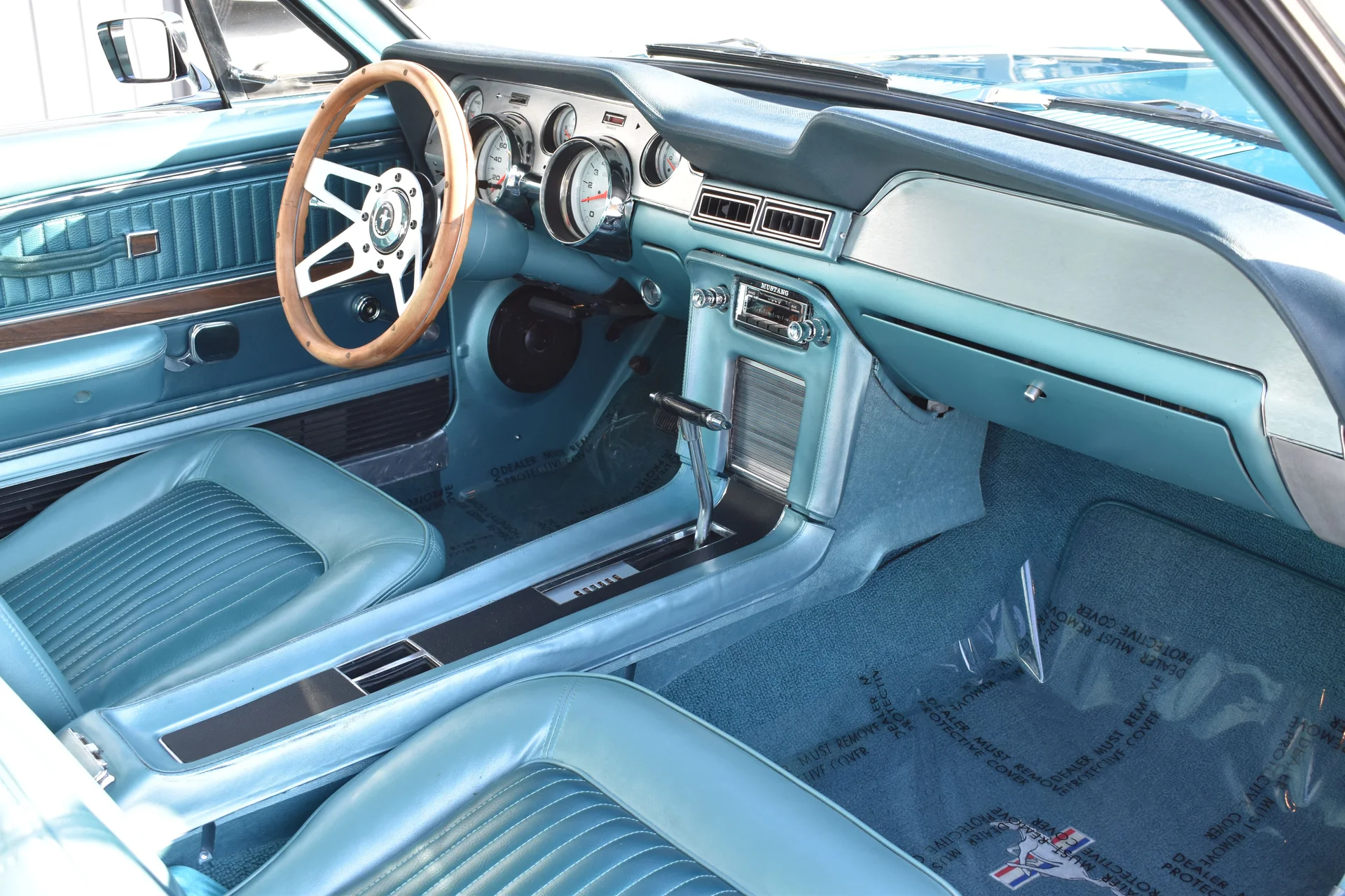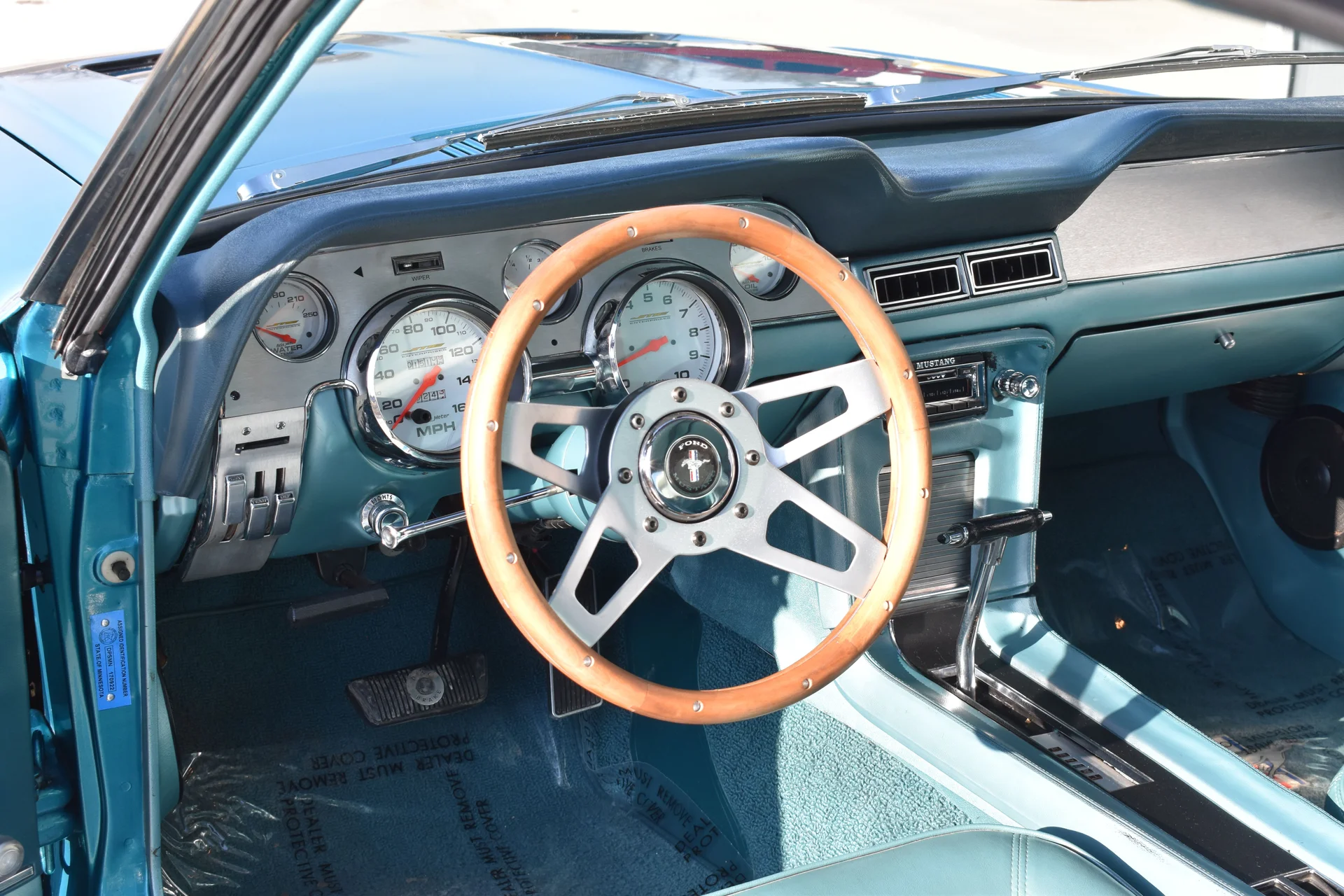 Inside, the fastback’s bucket-seat layout and driver-focused dash design reinforce the sporty environment these cars are known for. The aqua-blue interior ties in with the exterior color, creating a cohesive look that feels both period-correct and distinctive. Upgraded gauges and a vintage-style digital radio blend modern function with classic styling, making the cabin comfortable for extended cruising while preserving the Mustang’s original charm.